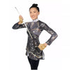 Una tela impresa digitalmente con una capa metálica y un cuello Mystique a juego.